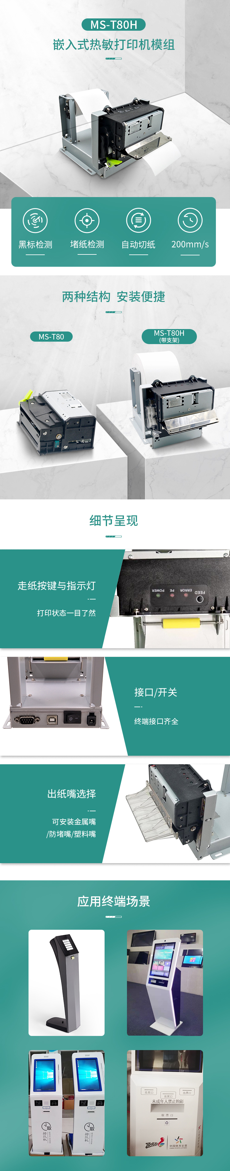 MS-T80/H 打印模塊采用AOI行式熱敏打印頭片,它具有高速打印、噪聲低、 可靠性強、打印質(zhì)量高。該打印機結(jié)構(gòu)小巧、同時擁有自動進紙、自動切紙、黑 標檢測、紙將盡檢測等功能。 此模組 ALL-IN-ONE,控制板與機芯完全結(jié)合為一體,大大節(jié)省了模組的空 間,極大地方便了模具的開發(fā)設(shè)計。此打印機擁有走紙按鍵及指示燈,讓終端用 戶使用起來更簡單、流暢。打印機適應(yīng)領(lǐng)域:適用于自助查詢終端、排隊機、ATM、彩票打印、日志打 印、自助話費清單打印機、自助發(fā)票打印、自助繳費機等領(lǐng)域的使用。