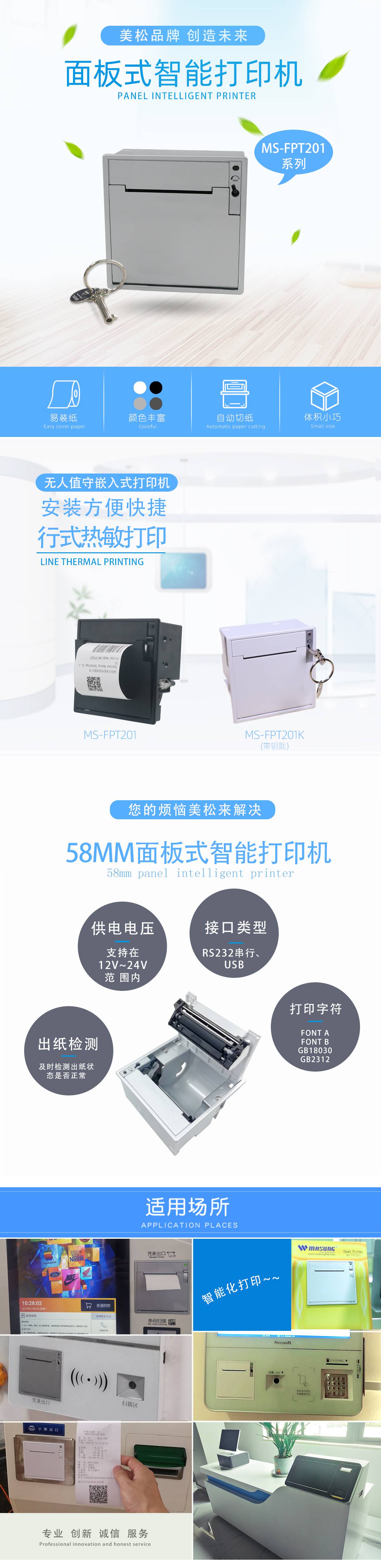 微型打印機(jī)介紹:與80mm微型熱敏打印機(jī)不同,這款是58MM的微型打印機(jī),型號為MS-FPT201微型打印機(jī)是一款58mm嵌入式微型打印機(jī),體積小巧,塑膠材料外殼,機(jī)身重量輕巧,配有鋅合金鑰匙開蓋,滿足不同需求的應(yīng)用場合,只需要簡單安裝就能實(shí)現(xiàn)打印功能的打印模塊,嵌入在不同的終端設(shè)備,例如加油站、餐飲收銀機(jī)、排隊(duì)繳費(fèi)機(jī)等,微型熱敏打印機(jī)是排隊(duì)機(jī),POS機(jī),加油站設(shè)備及醫(yī)療掛號繳費(fèi)等行業(yè)自助終端打印設(shè)備。