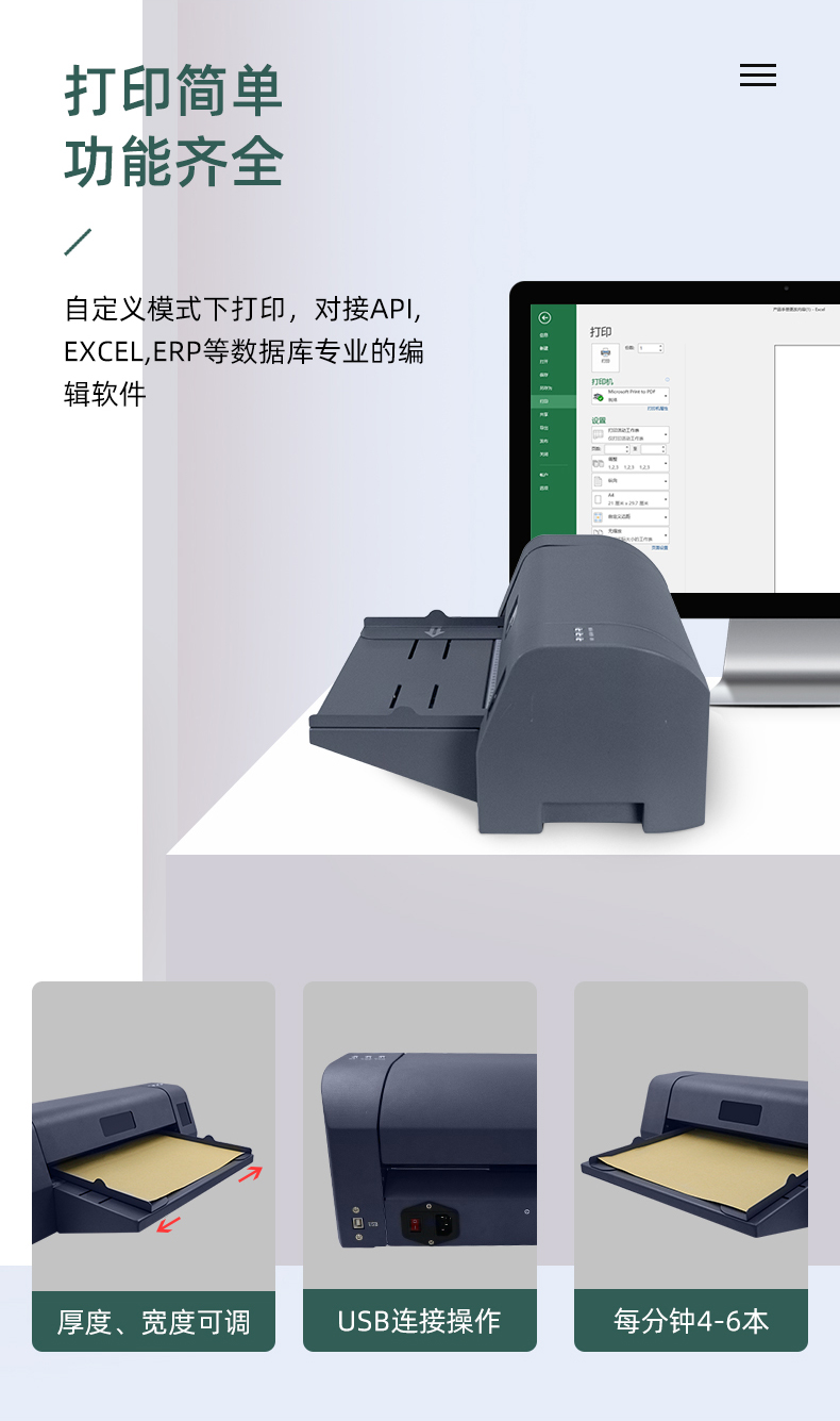 美松MASUNG自主研發(fā)熱轉(zhuǎn)印封面打印機(jī) 1.專(zhuān)業(yè)打印牛皮紙,不動(dòng)產(chǎn)等證件內(nèi)頁(yè),無(wú)酸紙檔案盒 2.對(duì)接API,EXCEL,ERP等數(shù)據(jù)庫(kù)專(zhuān)業(yè)的編輯軟件,自定義打印 3.USB連接操作簡(jiǎn)單,耗材成本低,長(zhǎng)久保存 4.快速打印,每分鐘4-6本,整齊規(guī)范化 5.進(jìn)紙厚度可調(diào),適合不同封面打印