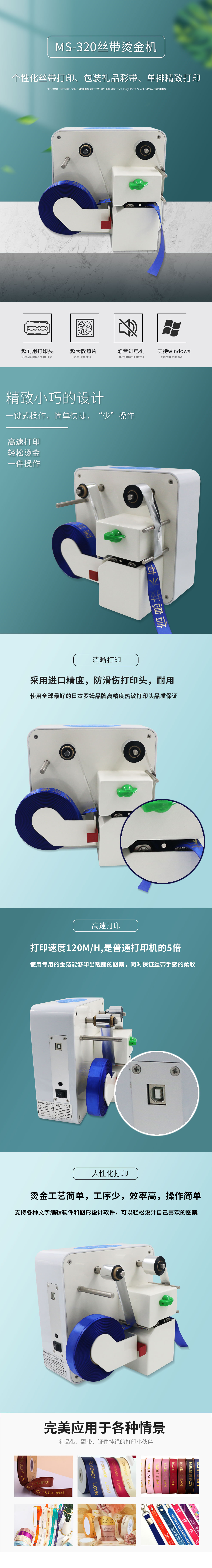 美松全自動絲印機(jī) 1.機(jī)器體積小巧,美觀(桌面擺設(shè)) 2.速度快(是普通打印機(jī)的5倍) 3.在絲帶上打印精美的圖案,文字,標(biāo)志 4.使用專用的金箔能夠印出靚麗的圖案,同時保證絲帶手感的柔軟 5.支持各種文字編輯軟件和圖形設(shè)計(jì)軟件,自定義打印商標(biāo)和文字