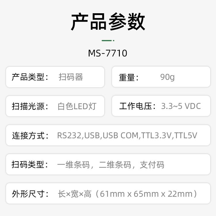 美松二維碼掃描模塊MS-7710采用遠(yuǎn)距離圖像傳感器,支持遠(yuǎn)距離識(shí)讀;針對(duì)陽(yáng)光和夜晚模式進(jìn)行優(yōu)化,全天24小時(shí)均可正常識(shí)讀,無(wú)人值守更省人工;兼容紙質(zhì)條碼掃描,為停車券應(yīng)用量身定制;寬溫-30~70度,南方北方輕松應(yīng)對(duì);豐富的接口適用各種傳輸方式;寬電壓設(shè)計(jì),供電更靈活,避免單獨(dú)再拉供電電源.圖像采集器與解碼板一體化設(shè)計(jì),重量極輕,集成度高,極易嵌入到各種產(chǎn)品應(yīng)用中,如公交掃描,自助機(jī)掃描,閘機(jī)掃描,取票機(jī)掃描,寄存柜掃描,智能門禁掃描.