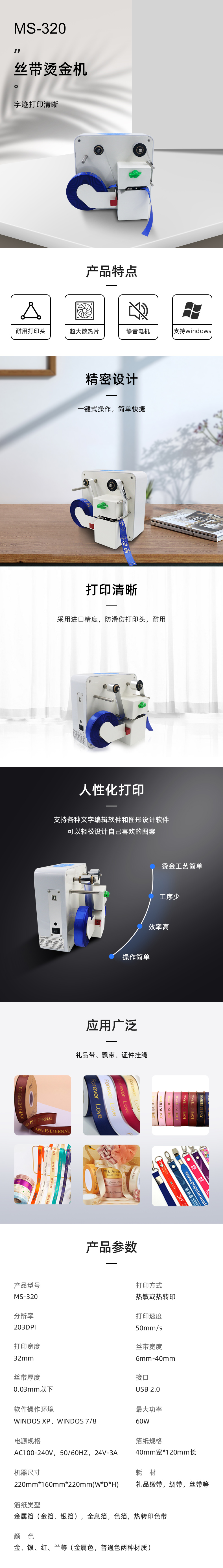 美松全自動(dòng)絲印機(jī) 1.機(jī)器體積小巧,美觀(桌面擺設(shè)) 2.速度快(是普通打印機(jī)的5倍) 3.在絲帶上打印精美的圖案,文字,標(biāo)志 4.使用專用的金箔能夠印出靚麗的圖案,同時(shí)保證絲帶手感的柔軟 5.支持各種文字編輯軟件和圖形設(shè)計(jì)軟件,自定義打印商標(biāo)和文字