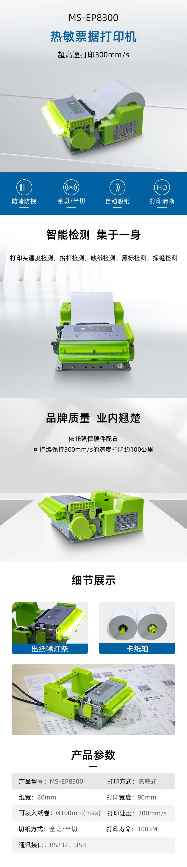 以“清新綠”作為主色新一輪創(chuàng)新的美松特色產(chǎn)品上市,在顏色上凸顯清新脫俗的生命力和綠色環(huán)保低碳的生活理念,讓人耳目一新; 在高效率打印技術上也突破了以往的打印速度,高配版本達到300mm/s,在保證打印質量的同時,超快打印速度 打印頭側翻蓋設計,維護簡單; 增加防堵紙檢測傳感器等功能,打印工作將故障排除在千里之外; 搭配100毫米直徑的紙卷,減少換紙頻率; 優(yōu)化外觀設計,選擇優(yōu)質圓潤的塑膠外殼,操作使用更加安全可靠; 一款打印寬度為80mm的熱轉印打印機,最大紙卷寬度為100mm