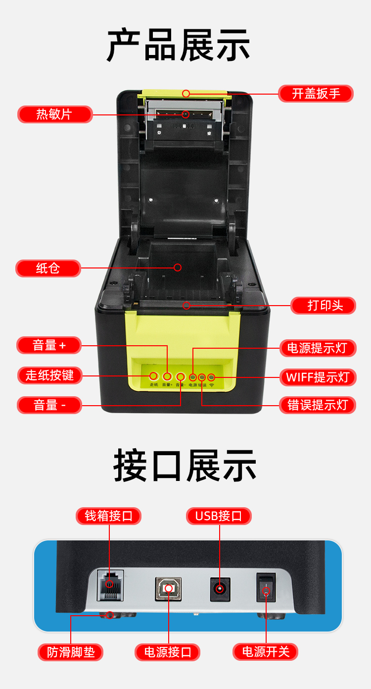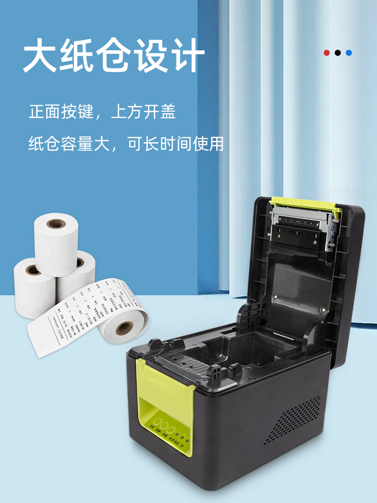 圖形、條形碼以每秒150毫米的速度輸出打印 打印紙厚為0.06~0.12mm熱敏紙 其外觀的清新別致,黑與白是永恒經(jīng)典色,搭配點綴上清新的綠與藍色 采用插墻式12V電源適配器,方便簡單又安全,絕對是您餐飲、商超、彩票、影院的專用打印機首選