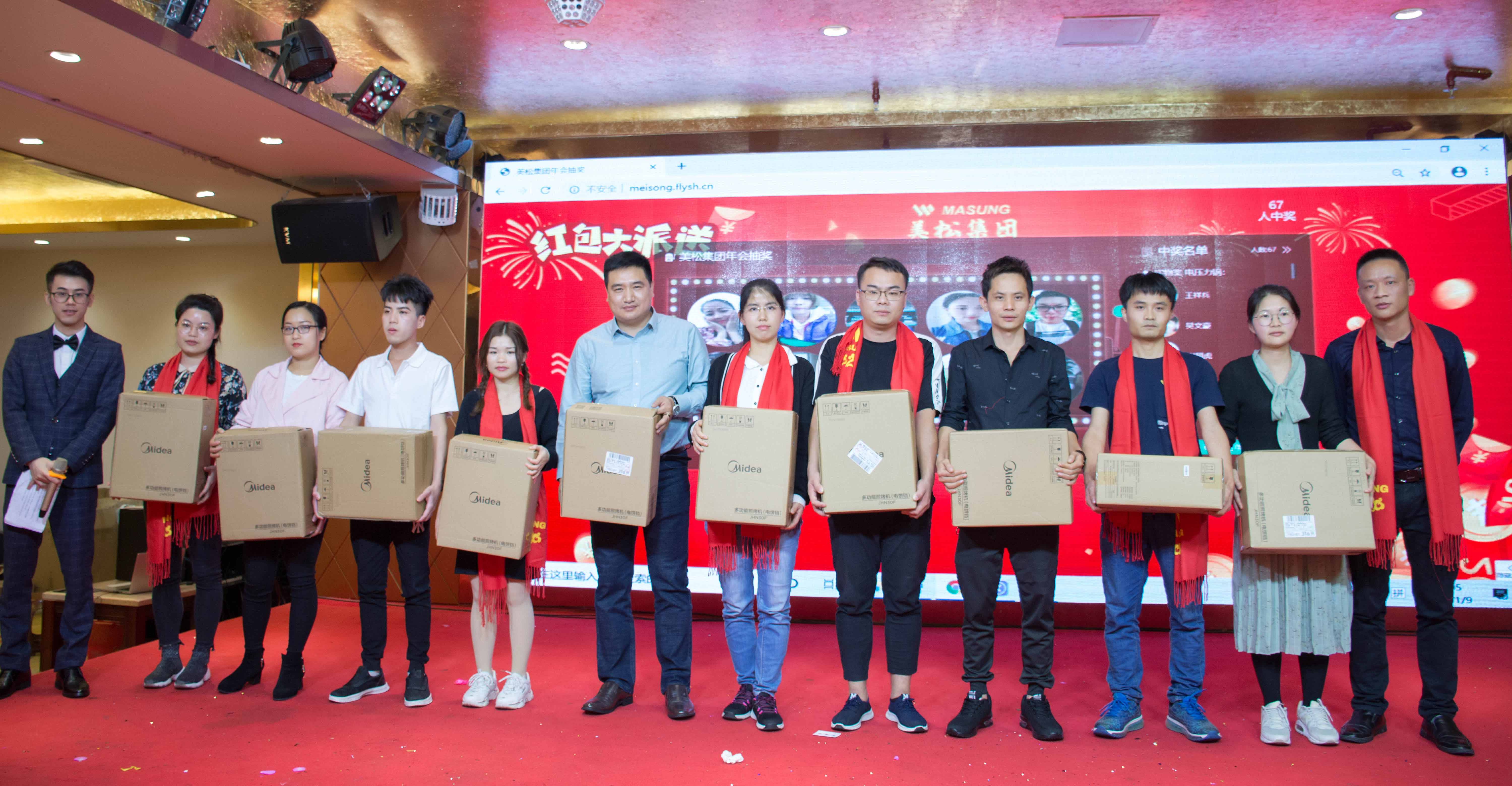 晚宴期間,相互舉杯、互道祝福、開懷暢飲,現(xiàn)場(chǎng)氣氛異常熱烈,這怎么能少了幸運(yùn)大抽獎(jiǎng)環(huán)節(jié)?現(xiàn)金獎(jiǎng)、實(shí)物獎(jiǎng)交替進(jìn)行,瞧!一張張笑臉上告訴著我們,他們有多幸運(yùn),也希望能把這份幸運(yùn)傳遞給身邊的每個(gè)人!本次年度盛典大會(huì)期間也迎來(lái)了老朋友: 深圳市馳卡技術(shù)有限公司總經(jīng)理薛明明先生及其團(tuán)隊(duì) 、東莞市立派五金有限公司總經(jīng)理嚴(yán)新俊先生、東莞市飛鷹五金模具有限公司總經(jīng)理鄧永平先生、深圳市深一創(chuàng)科技有限公司總經(jīng)理杜勇先生及鄂州商會(huì)成員(排名不分先后),感謝他們一直以來(lái)對(duì)美松集團(tuán)的支持與信任,正是因?yàn)橛辛怂麄?,我們才有無(wú)窮的力量一路披荊斬棘!