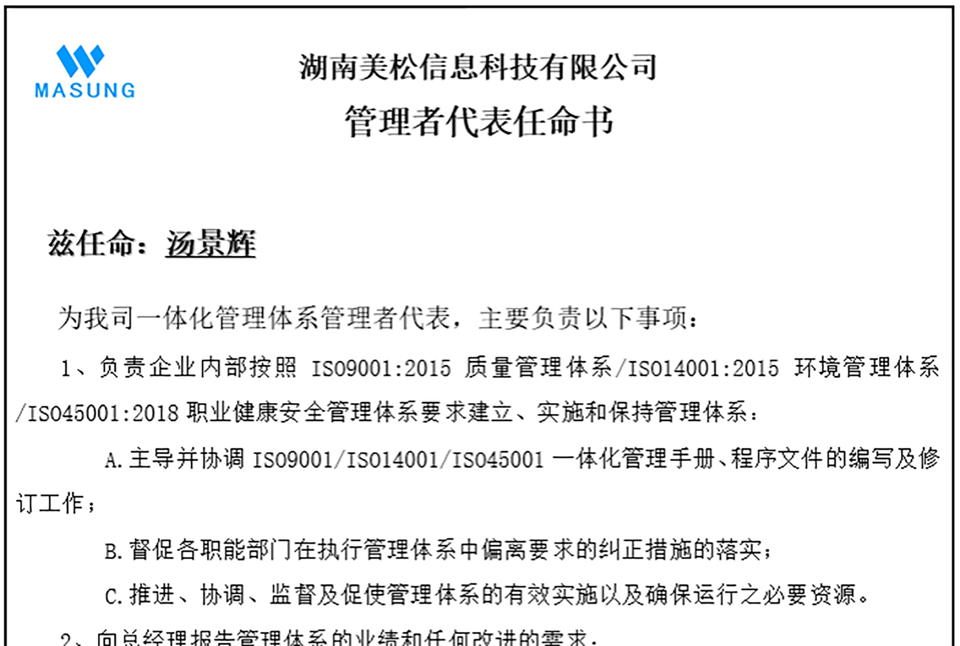 會(huì)議最后,饒老師激勵(lì)大家:體系管理絕非一朝一夕之功,而是一項(xiàng)需要不斷學(xué)習(xí)、改進(jìn)和堅(jiān)持的長(zhǎng)期工程。在座每一位美松人都是體系建設(shè)的主力軍,也是公司持續(xù)發(fā)展的中堅(jiān)力量。未來(lái)愿與美松一起在體系管理的道路上不斷探索、不斷創(chuàng)新。以ISO系列體系為支撐,必將打造品質(zhì)+綠色+安全MASUNG美松的企業(yè)品牌,創(chuàng)造更多的價(jià)值。