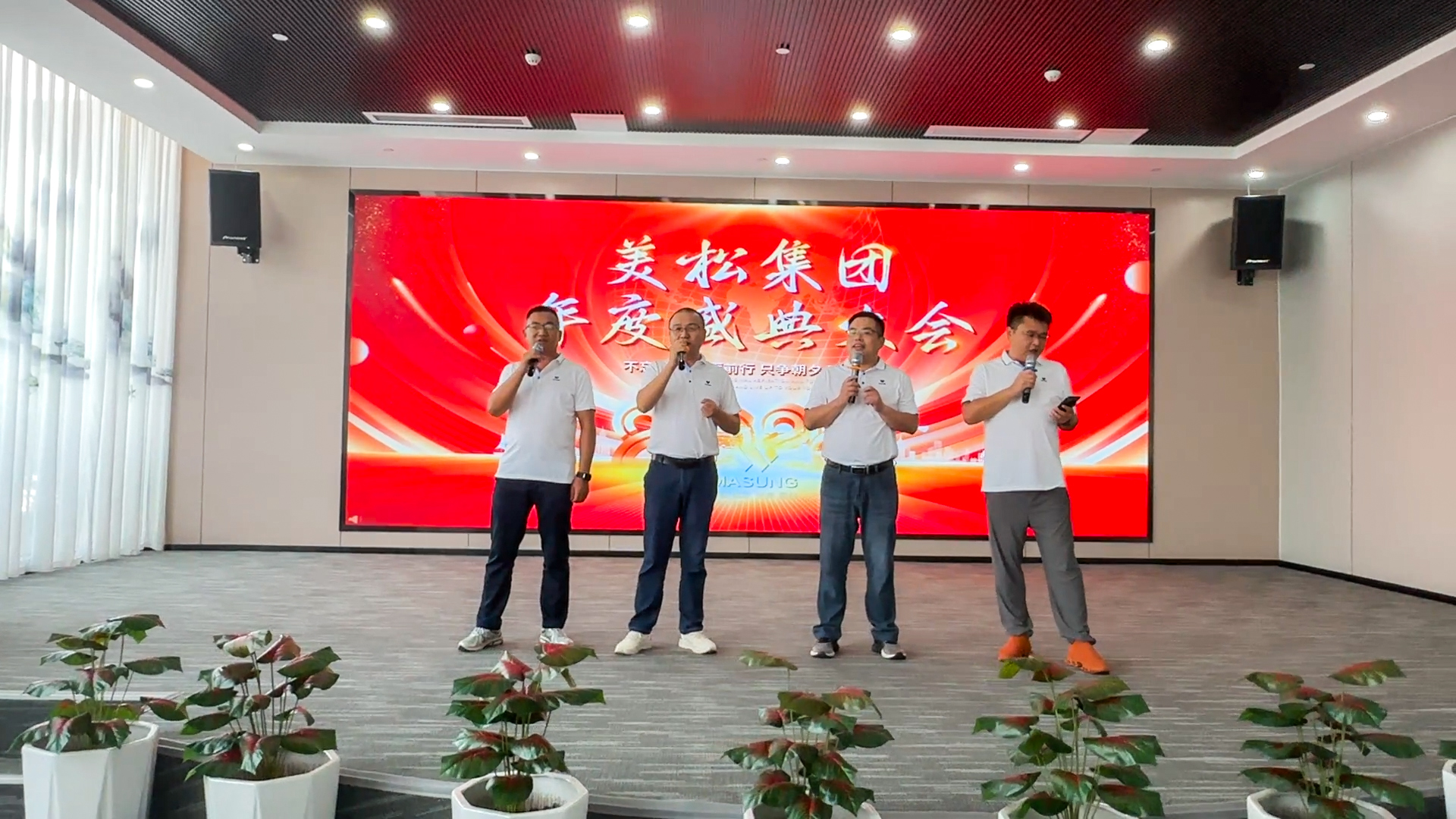 四位主持人整齊亮相開啟序幕,由美松智能銷售部總經(jīng)理李光輝帶領(lǐng)的” 四大金剛”上臺(tái)領(lǐng)唱美松主題曲《我的夢(mèng)》,當(dāng)歌聲響起,現(xiàn)場(chǎng)激勵(lì)氣氛高漲。