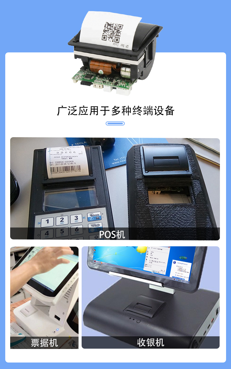 微型打印機(jī)特點(diǎn):前開蓋維護(hù),無(wú)需拆開終端設(shè)備就可實(shí)現(xiàn)換紙和維護(hù),8V~12V低電壓供電58mm打印機(jī),嵌入體積小巧