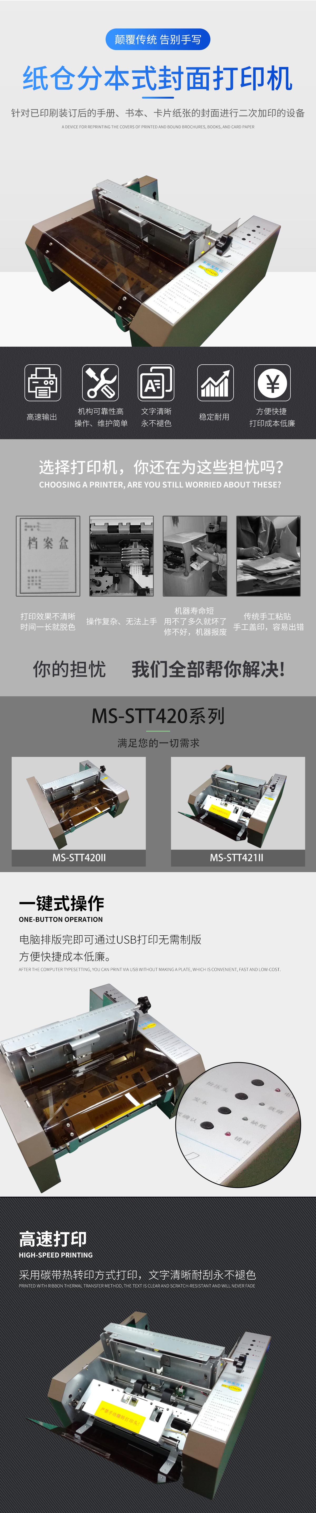 美松MS-STT420II是熱轉(zhuǎn)印設(shè)備,利用熱轉(zhuǎn)印技術(shù),實(shí)現(xiàn)紙倉(cāng)分本式封面打印機(jī)針對(duì)已印刷裝訂后的手冊(cè),書(shū)本,卡片紙張的封面進(jìn)行二次加印的設(shè)備.采用碳帶熱轉(zhuǎn)印方式打印,文字清晰耐刮永不褪色.電腦排版完即可通過(guò)USB打印無(wú)需制版,方便快捷成本低廉.可調(diào)打印件厚度及可調(diào)紙倉(cāng)式多本裝入,機(jī)構(gòu)可靠性高,操作,維護(hù)簡(jiǎn)單.
