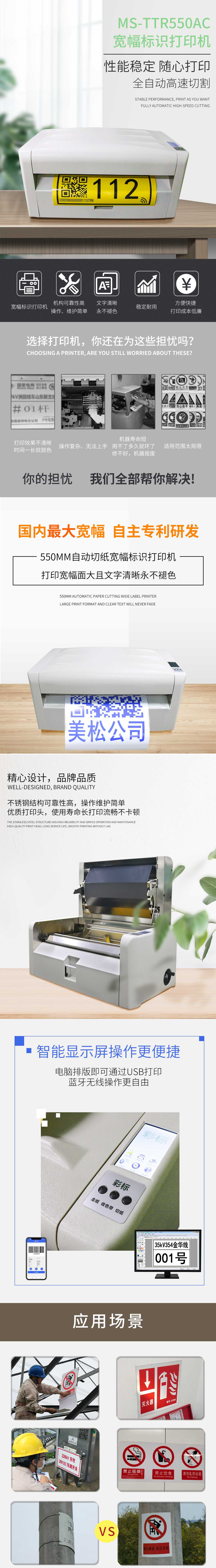 美松MS-TTR550AC熱轉(zhuǎn)印標識標牌打印機是針對寬橫幅印刷且自動切割的設備.熱轉(zhuǎn)印設備能打印pvc不干膠紙,pvc標簽紙,pvc標牌紙,pvc電纜標牌,復合材料封面,熱轉(zhuǎn)印機采用碳帶熱轉(zhuǎn)印方式打印,打印幅面大且文字清晰耐刮永不褪色.電腦排版完即可通過USB打印無需制版,方便快捷.機構可靠性高,操作,維護簡單.