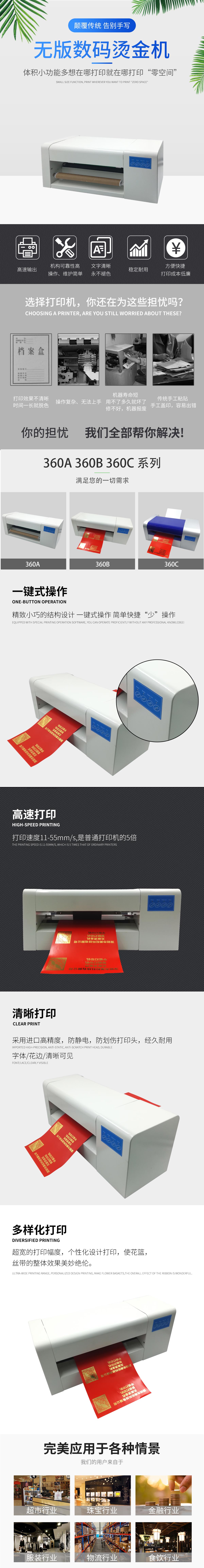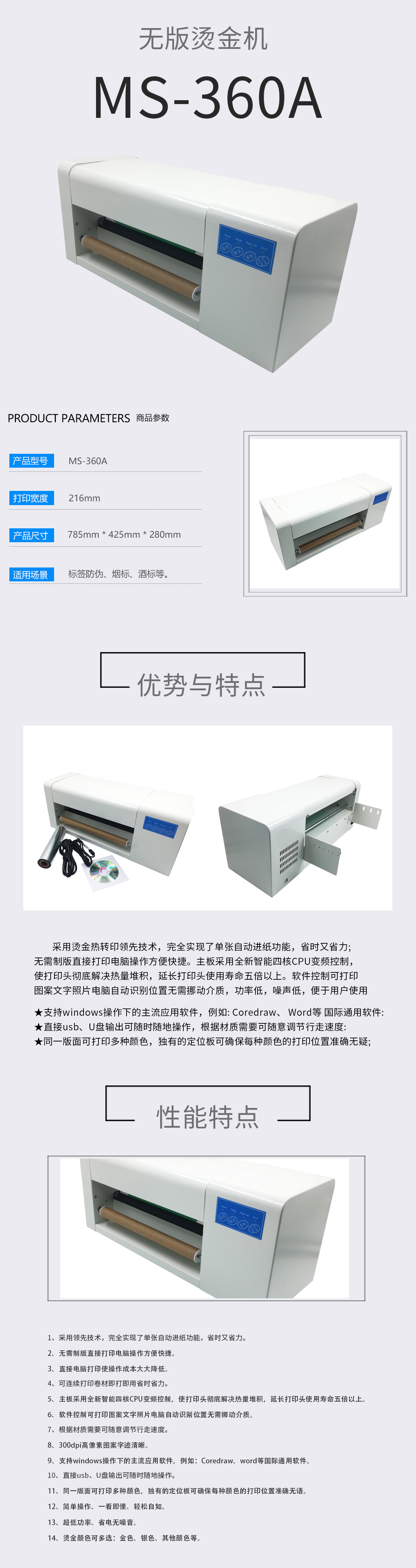 美松數(shù)碼無(wú)版燙金機(jī)印花機(jī)采用燙金熱轉(zhuǎn)印領(lǐng)先技術(shù),完全實(shí)現(xiàn)了單張自動(dòng)進(jìn)紙功能,省時(shí)又省力;無(wú)需制版直接打印電腦操作方便快捷.印花機(jī)主板采用全新智能四核CPU變頻控制,使打印頭徹底解決熱量堆積,延長(zhǎng)打印頭使用壽命五倍以上.印花機(jī)軟件控制可打印圖案文字照片電腦自動(dòng)識(shí)別位置無(wú)需挪動(dòng)介質(zhì),功率低,噪聲低,便于用戶使用.支持windows操作下的主流應(yīng)用軟件,例如: Coredraw, Word等國(guó)際通用軟件;直接usb,U盤輸出可隨時(shí)隨地操作,根據(jù)材質(zhì)需要可隨意調(diào)節(jié)行走速度;同一版面可打印多種顏色,獨(dú)有的定位板可確保每種顏色的打印位置準(zhǔn)確無(wú)疑.