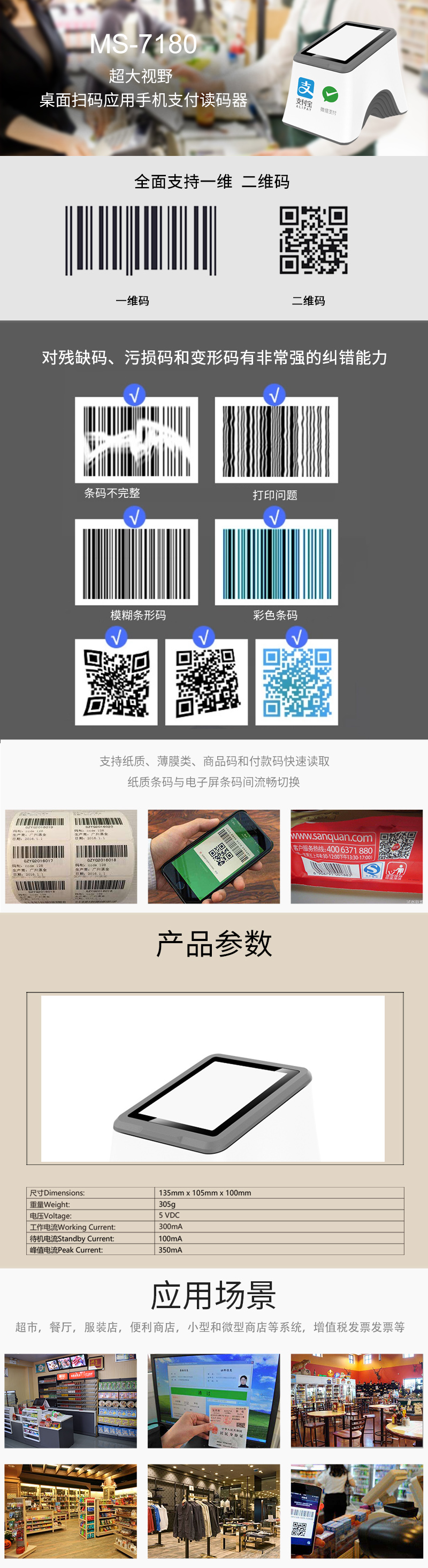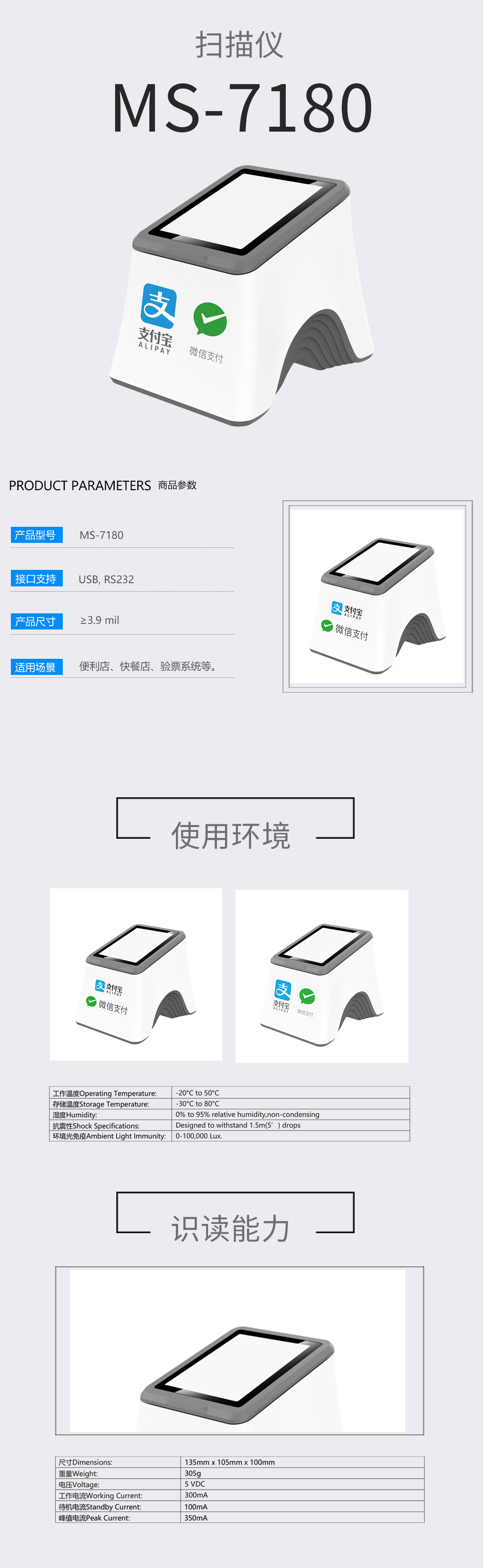 美松二維碼掃描模塊MS-7180掃描二維碼收款,條碼掃描收款,大窗口模式,支持貼屏掃碼,無(wú)需對(duì)準(zhǔn);支持微信,支付寶,美團(tuán)等掃碼支付;掃碼成功語(yǔ)音播報(bào) ,解放收銀員,更避免漏單;接口豐富,內(nèi)置RS232 和USB接口;經(jīng)典外觀設(shè)計(jì),視場(chǎng)40.5°(H)x31°(V),運(yùn)動(dòng)容差>2m/s,接口支持USB, RS232,掃碼槍二維碼支付盒子,掃描平臺(tái),超市收銀,醫(yī)院藥店電子醫(yī)???社???健康碼掃描器掃碼墩小白盒,手機(jī)支付/電子醫(yī)???健康碼.
