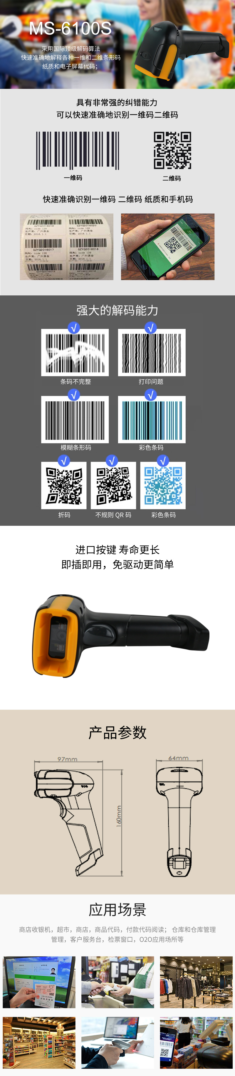 30萬(wàn)像素二維有線掃描槍MS-6100S 手持式二維條碼掃描器 開票功能︰支持支付寶開票功能,方便使用 更流暢的閱讀手機(jī)支付條碼的能力∶支持支付寶,微信支付功能 開機(jī)迅速,即插即用