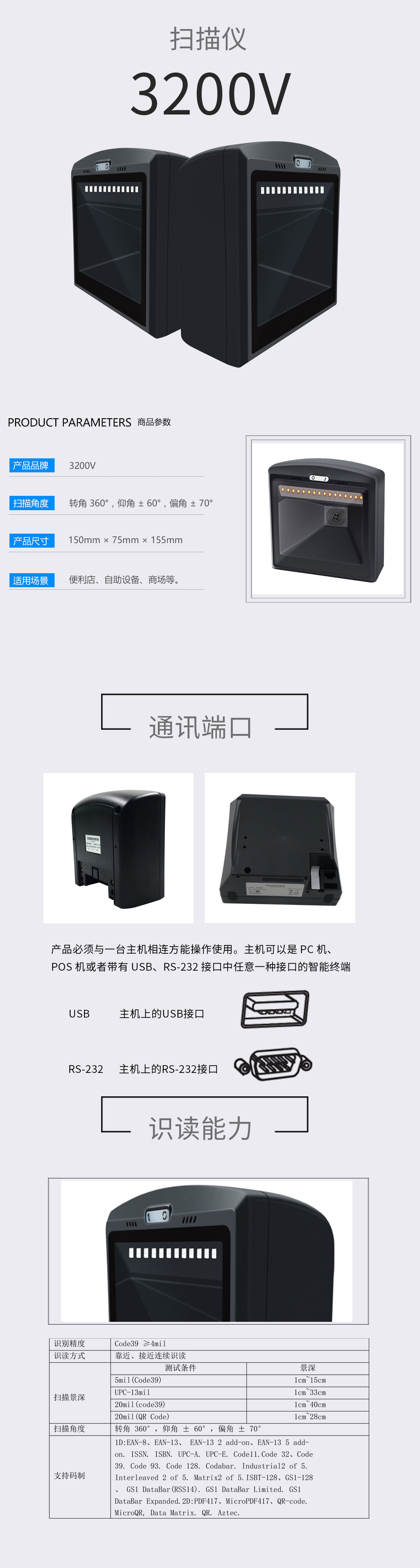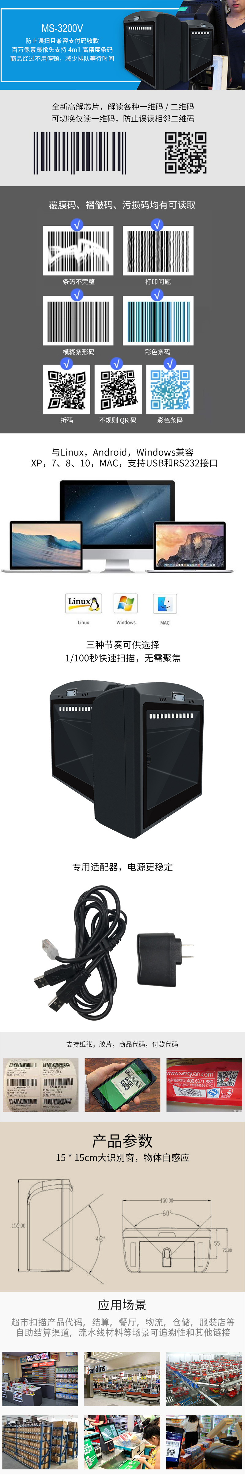 美松二維碼掃描平臺MS-3200V掃描完全自主研發(fā),擁有全套專利,即插即用無需安裝驅(qū)動.寬電壓設計,專用適配器,供電更穩(wěn)定,避免了因電壓波動導致數(shù)據(jù)傳輸無法上傳情況的發(fā)生.采用 32 位主控芯片搭載專利軟體,可順暢解讀反光,打皺,模糊,彩色條碼,強光及暗光環(huán)境下也可正常解碼.采用全鉭電容及抗氧化光學工藝,避免了傳統(tǒng)掃描槍使用一段時間后靈敏度下降問題.二維影像式掃描平臺,掃描槍,掃碼器,餐飲零售,快遞倉儲,物流超市,商品條碼,手機屏幕掃碼收款.兼容Linux,Android,Windows XP,7,8,10,MAC,支持USB和RS232接口.支持紙質(zhì),薄膜類,商品碼,付款碼讀取,支持低對比度,高密度的DM碼等的讀取.
