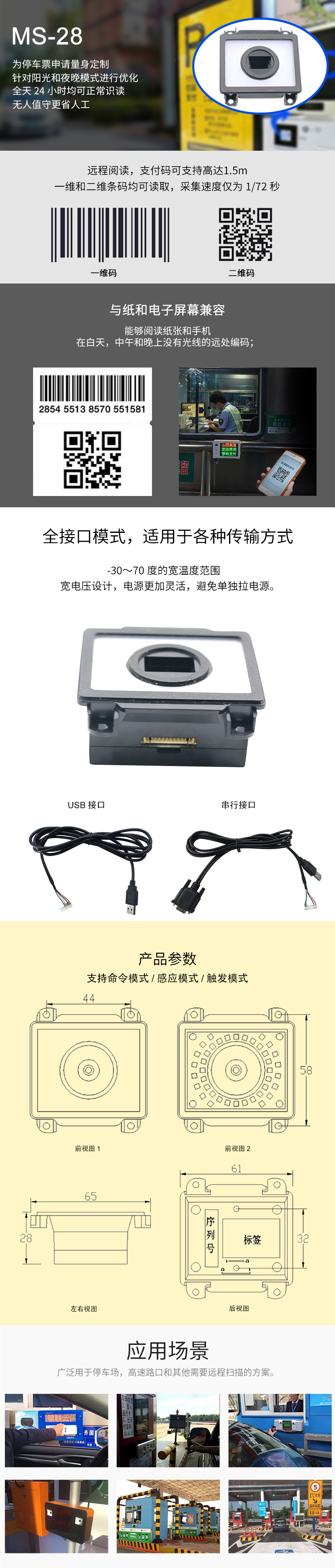 美松二維碼掃描模塊產(chǎn)品特性 1.兼容紙質(zhì)和電子屏,一維和二維條碼均可識(shí)讀. 2.遠(yuǎn)距離識(shí)讀,支付碼最遠(yuǎn)支持1.5M遠(yuǎn)距離識(shí)讀. 3.兼容白天正午和深夜無(wú)光環(huán)境下識(shí)讀紙質(zhì)和手機(jī)碼遠(yuǎn)距離識(shí)讀. 4.掃碼距離微信,支付寶支付條碼10-110cm極速遠(yuǎn)距離掃描 5.360°識(shí)讀;在80cm景深掃描寬度50cm(實(shí)測(cè)) 6.全接口模式:支持RS485 ,RS232,USB,TTL電平 7.寬溫實(shí)測(cè)-30~70℃更適于戶外使用 8.同時(shí)支持陽(yáng)光暴露情況和夜晚識(shí)讀手機(jī)和紙質(zhì)條碼