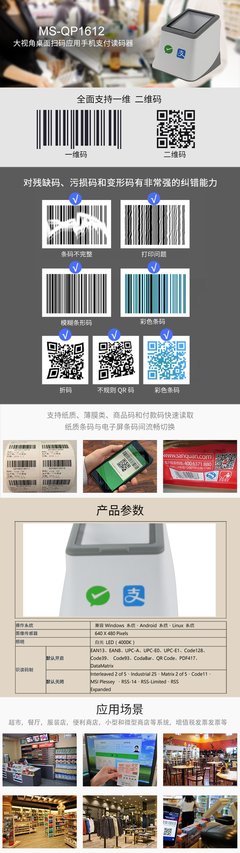 1.大窗口,經(jīng)典外觀,支持貼屏掃碼 2.支持微信、支付寶、美團等掃碼支付 3.掃碼成功語音播報 ,解放收銀員,避免漏單 4.接口豐富,內(nèi)置RS232 和USB接口