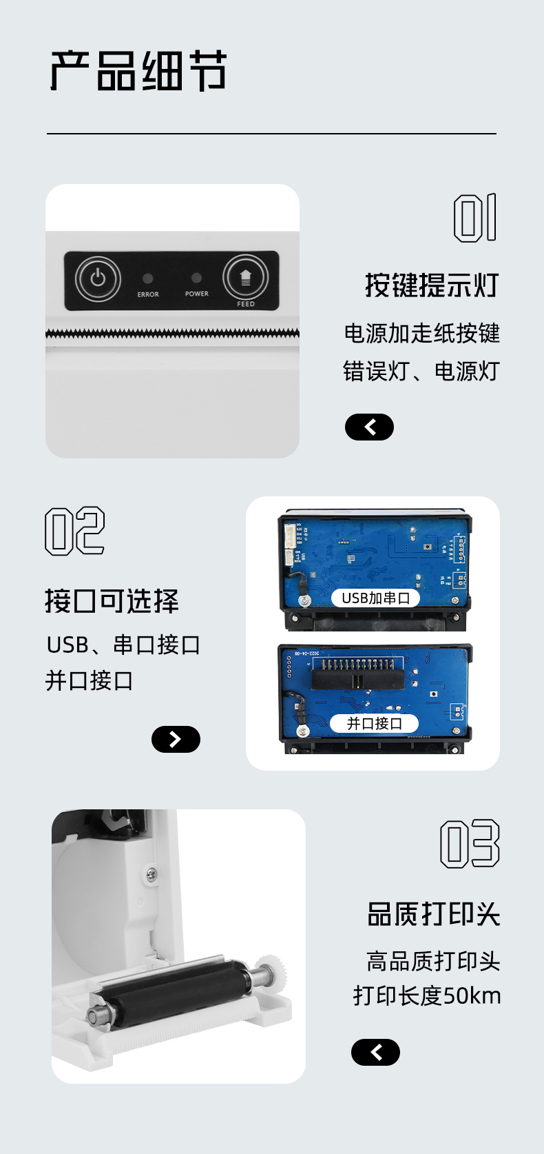 1.易裝紙結(jié)構(gòu) 2.低噪音熱敏打印 3.支持錢箱接口 4.支持圖文打印 5.紙卷60毫米外徑紙卷 6.大齒輪、大膠輥、大馬達機芯設(shè)計耐用可靠 7.支持Web打印,以及多種驅(qū)動Windows,Linux,Android