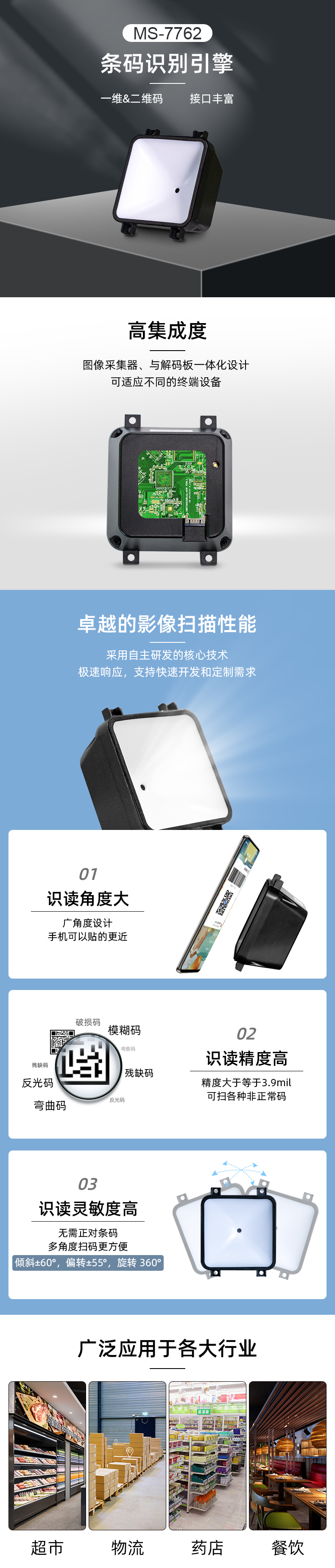 兼具一維/二維碼;4mil紙質(zhì)和手機(jī)碼掃描 支持“貼面”和快速移動(dòng)過程中識(shí)讀 內(nèi)置RS232\USB接口和蜂鳴器 28MM超薄設(shè)計(jì)更宜集成 支持陽光下和完全黑暗環(huán)境識(shí)讀