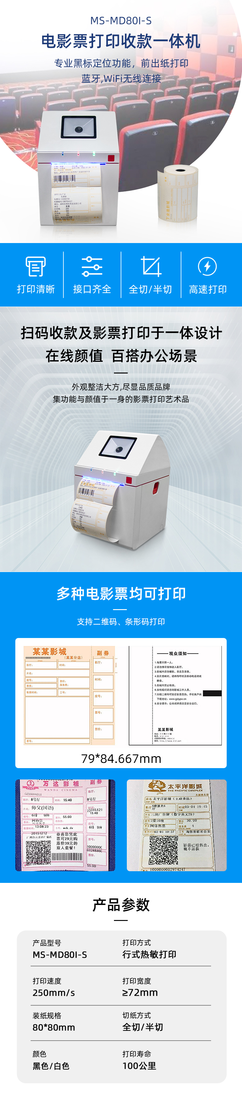 80mm專用型電影票打印機(jī) 具有黑標(biāo)定位紙位置 多種接口連接方式支持 集掃碼收款收銀于一體更加方便快捷