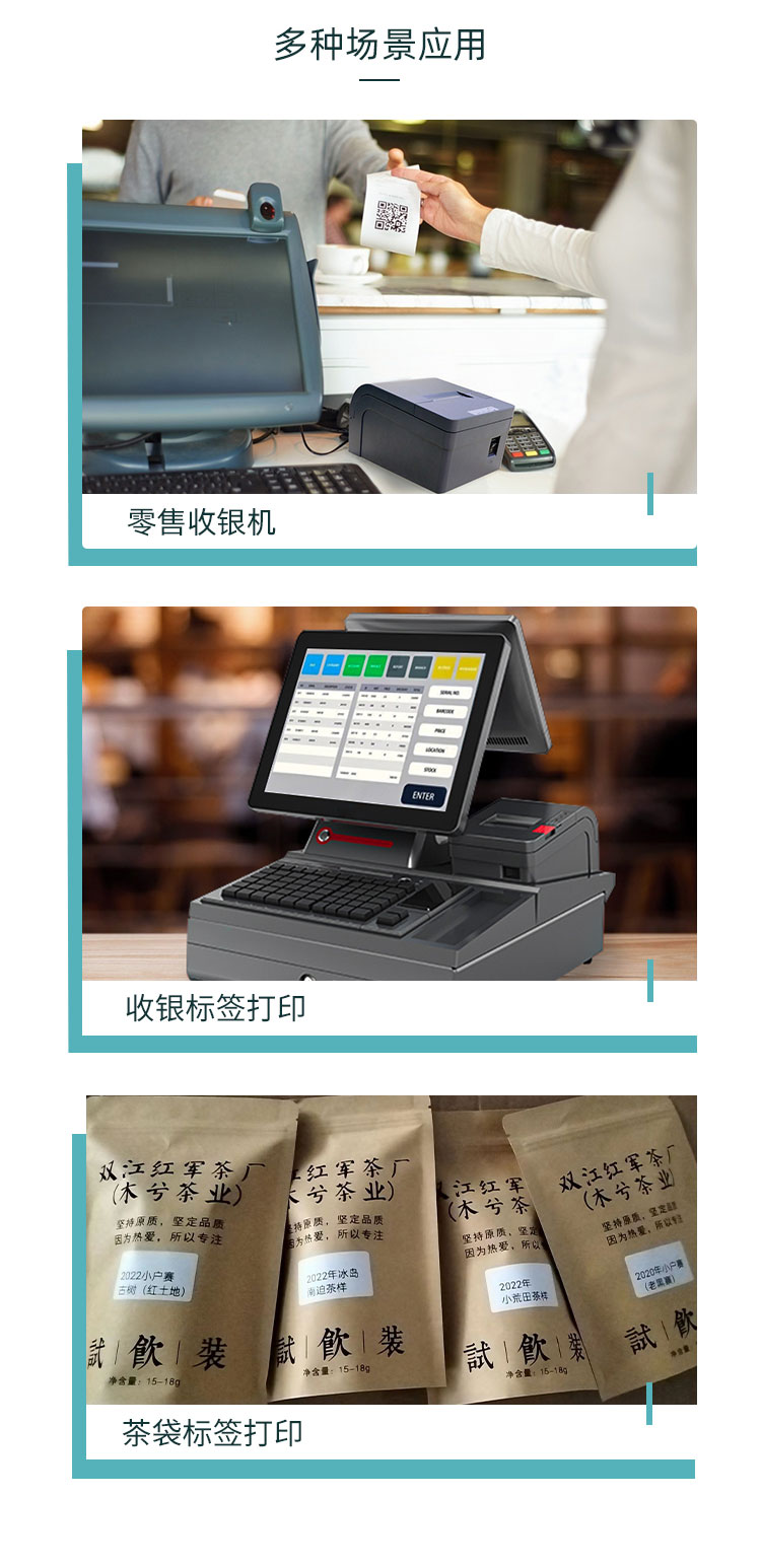 可以打印熱敏票據(jù)紙和熱敏不干膠紙,適合市面上絕大多數(shù)的打印需求。 支持條碼打印、標(biāo)簽打印、不干膠打印、熱敏紙打印、收銀紙打印、價(jià)簽打印等多種打印方式。 可裝入50mm直徑的紙卷,具有USB、Wiff、串口、并口、藍(lán)牙等通訊方式可選, 58mm桌面式熱敏不干膠標(biāo)簽打印機(jī),可適用于多種場(chǎng)合,進(jìn)行標(biāo)簽打印,商超零售貨架標(biāo)簽,水果店鋪價(jià)格標(biāo)簽,購(gòu)物稱(chēng)重標(biāo)簽,醫(yī)療標(biāo)簽。