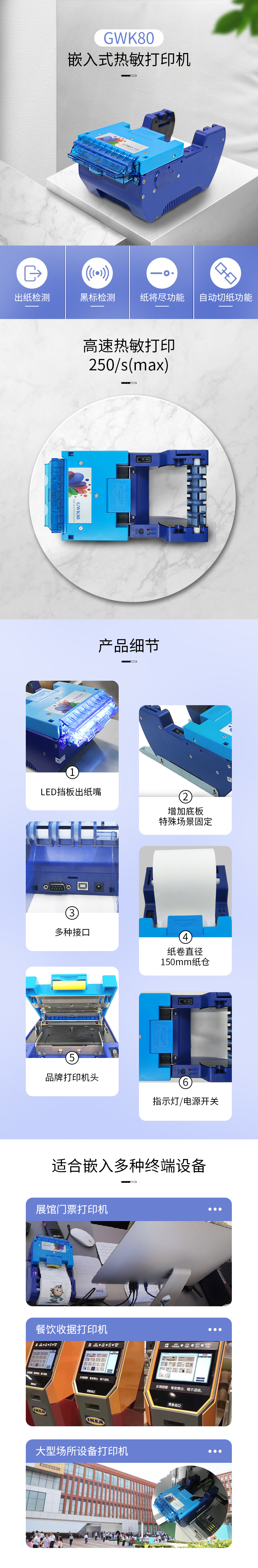 GWK80自助零售餐飲收銀小票機,票據(jù)單據(jù)收據(jù)專用打印機 送貨單銷貨單打印,80mm熱敏打印機,可打印80毫米或82.5毫米的紙寬,入紙口與出紙口水平出紙,為走紙?zhí)峁╊愃茩C場跑到的場地,極大限度保證走紙順暢,避免打印卡紙,降低打印故障,防堵防拽LED擋板出紙嘴,隨時檢測走紙情況,黑標檢測功能,檢測黑標位置并實現(xiàn)打印,適用于電影院和彩票等行業(yè).GWK80適用于打印量大、打印內(nèi)容特殊化、票據(jù)格式多樣化等行業(yè)的應(yīng)用,應(yīng)用場景多見于醫(yī)院、銀行、政務(wù)、交通等人流量較多的行業(yè)。
