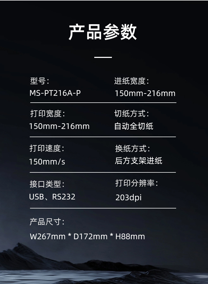 MS-PT216A-P_A4熱敏打印機, 一款全新大幅面熱敏打印機,打印寬度150mm-216mm可調(diào)節(jié)。 體積尺寸相比同類產(chǎn)品更為小巧。 打印速度可達150mm/s 有效容紙,杜絕打印過程中拉扯造成的卡紙 先打印完成并切紙,一次性把紙送出 容紙器可開蓋,維護方便快捷
