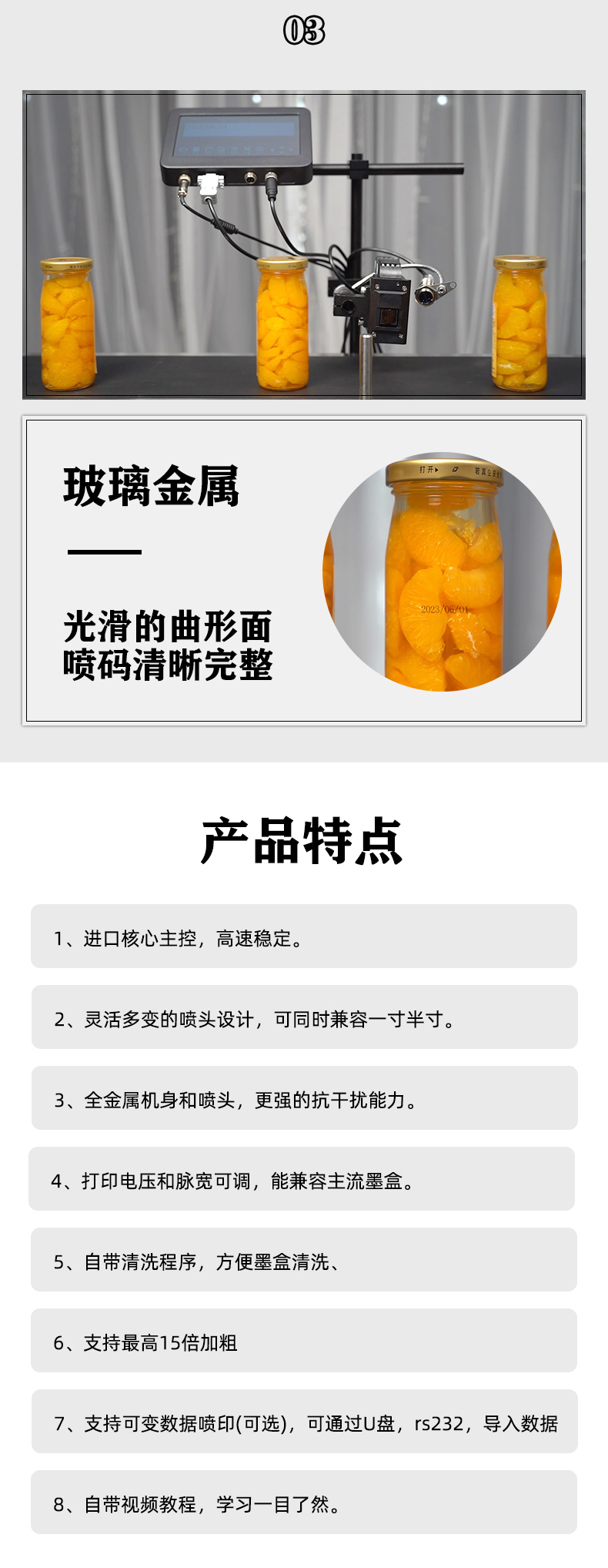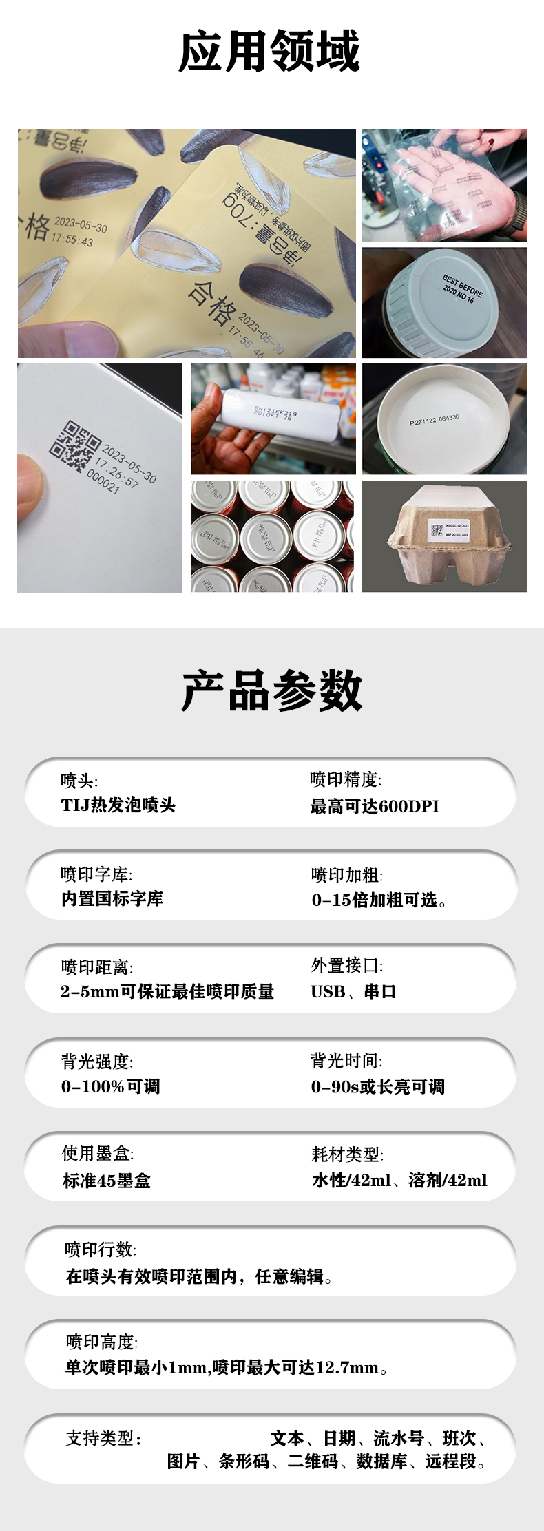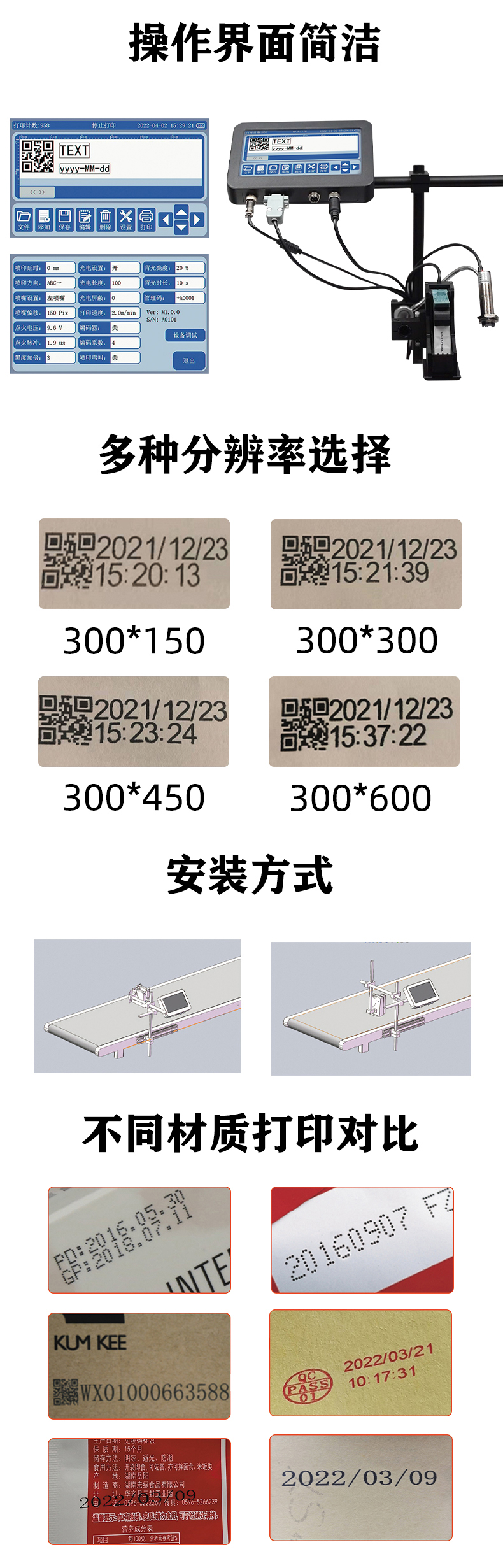 1、進口核心主控,高速穩(wěn)定。 2、靈活多變的噴頭設計,可同時兼容一寸半寸。 3、全金屬機身和噴頭,更強的抗干擾能力。 4、打印電壓和脈寬可調,能兼容主流墨盒。 5、自帶清洗程序,方便墨盒清洗、 6、支持最高15倍加粗 7、支持可變數(shù)據(jù)噴印(可選),可通過U盤,rs232,導入數(shù)據(jù) 8、自帶視頻教程,學習一目了然。