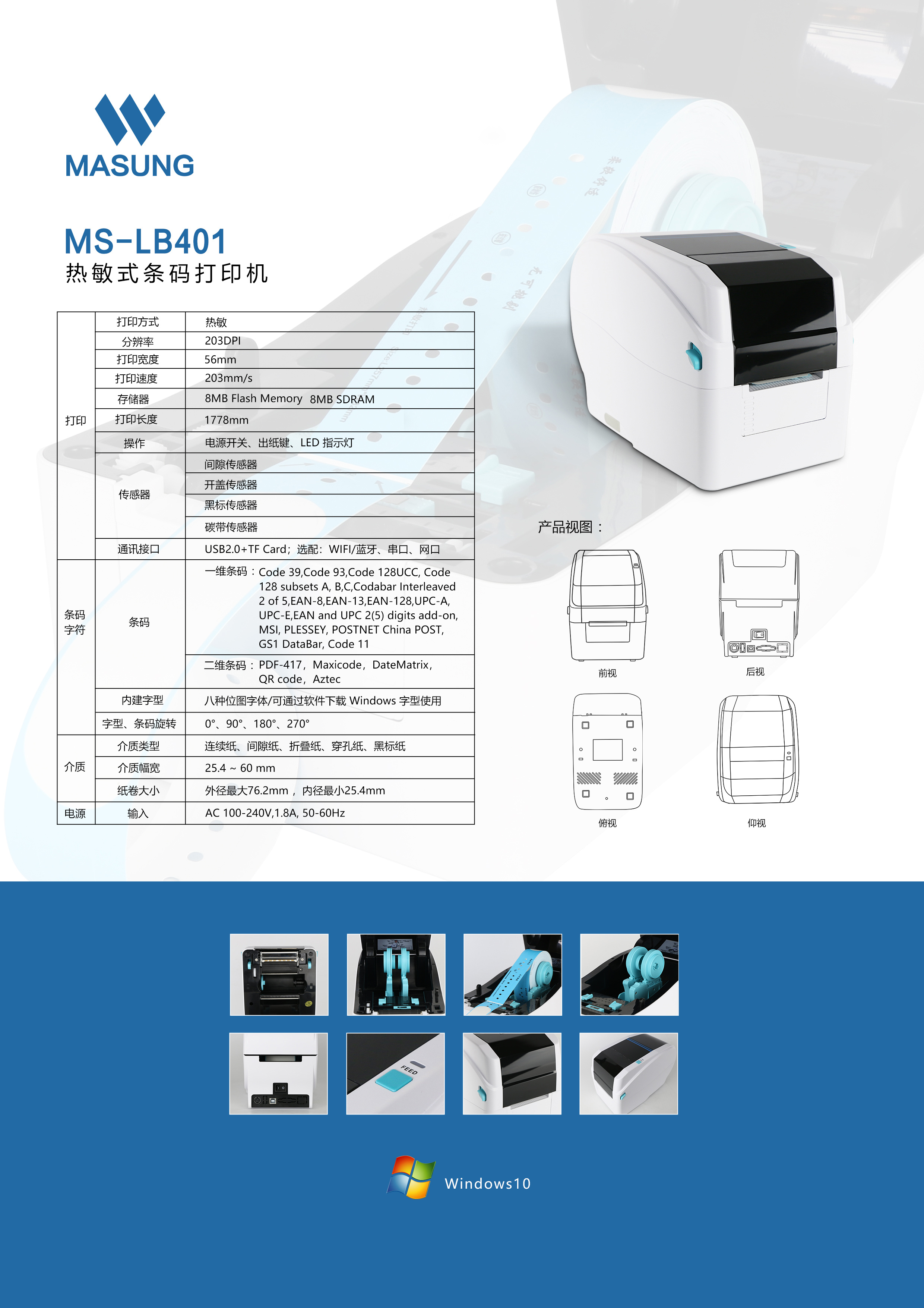 MS-LB401_熱敏熱轉(zhuǎn)印腕帶打印機,是由美松研發(fā)的一款熱敏熱轉(zhuǎn)印多類型的打印機,主要應(yīng)用于醫(yī)療標簽腕帶的打印使用,它的體積小巧,同時還具有高速度的打印功能。 MS-LB401具有多種接口類型,可通過藍牙,WIFI和網(wǎng)口、串口等多種方式進行連接傳輸,可使用的打印介質(zhì)有腕帶紙和連續(xù)紙、間隙紙和折疊紙、穿孔紙和黑標紙 內(nèi)部配有限紙和限位器能快速的裝紙進行打印
