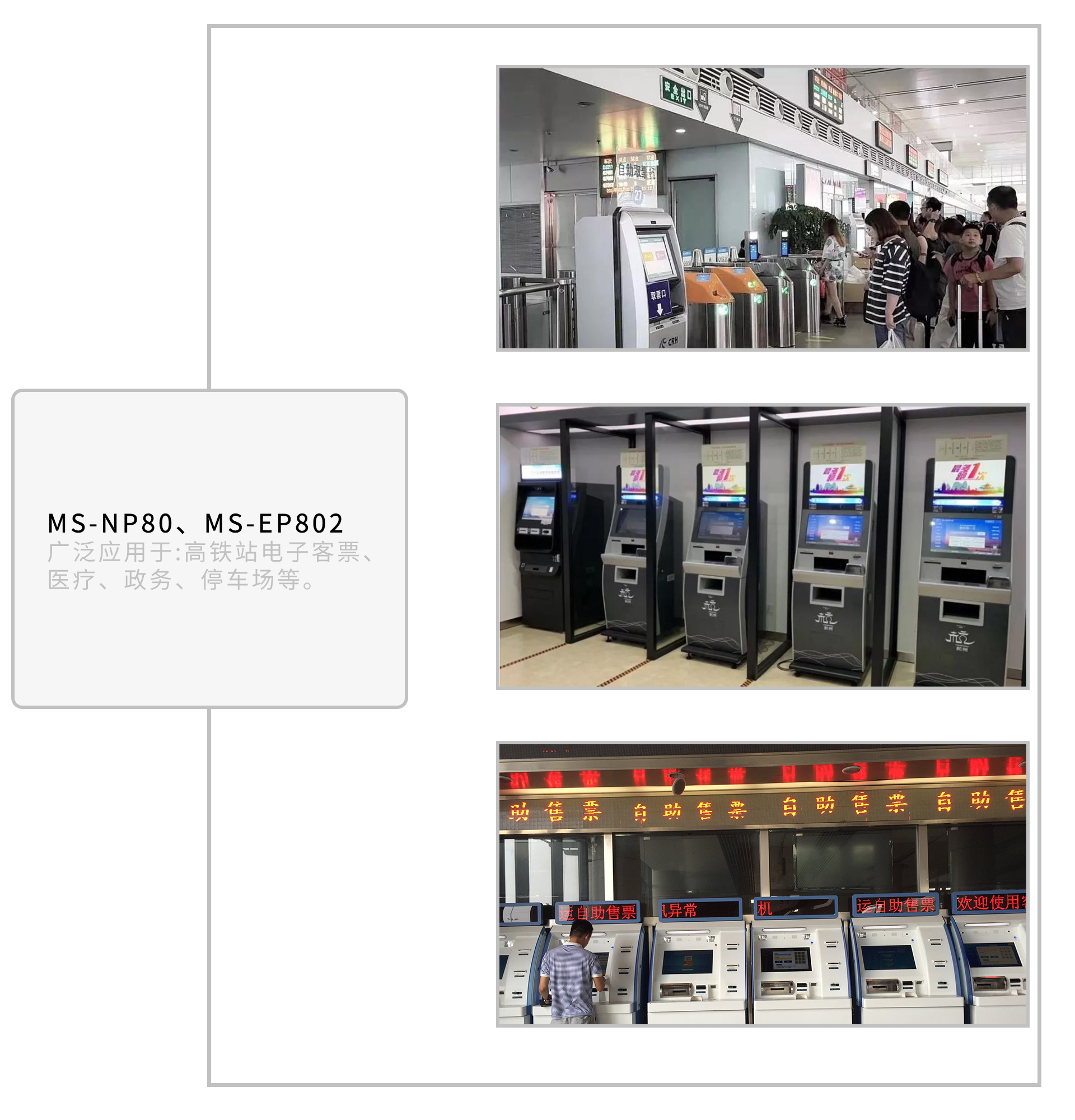 自2018年以來,由我美松公司研發(fā)的MS-NP80,MS-EP802系列打印機與國內外多家公司合力打造的高鐵站電子客票、醫(yī)療、政務、停車場等各大智慧市場領域場景,目前廣泛上線并應用。