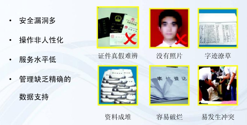 傳統(tǒng)人工手寫的來訪登記方式存在很多安全漏洞,如今假證橫行,辦理假證的犯罪手法也是日漸高明,直接導(dǎo)致門衛(wèi)無法用眼識(shí)別真假證件,并且人工登記復(fù)雜、繁瑣、紙質(zhì)登記不易保存查詢信息。網(wǎng)上經(jīng)常有報(bào)道訪客手工登記管理漏洞引發(fā)的安全事件接二連三,因?yàn)閭鹘y(tǒng)的訪客手工登記存在的問題太多。